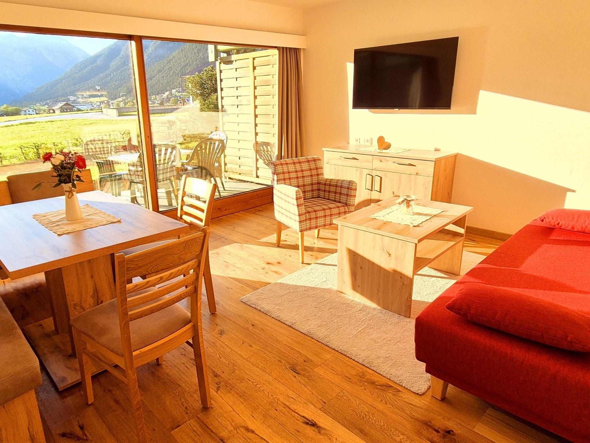 Wohnschlafzimmer mit zwei Couches und Tischchen, gepolsterter Eßecke und Bauernkomode. Dreibettzimmer mit 2 Fauteuils und Tischchen, Wandvertäfelung. Große Schiebetüre zum Liegebalkon bzw. zur Gartenterasse. Vorraum mit Schrank. Frisch renoviertes Badezimmer mit Dusche, Waschbecken, WC und Heizstrahler. Separate Küche mit 3-Platten-Herd, Kühlschrank, Geschirrspülmaschine, Mikrowellenherd, Dunstabzug, kompl. Geschirr, Kaffeemaschine. Farb-TV, Safe, Internetanschluss. Haustiere sind nicht erlaubt!