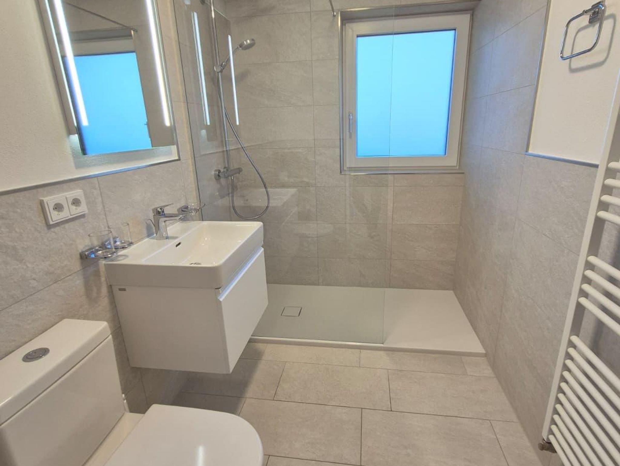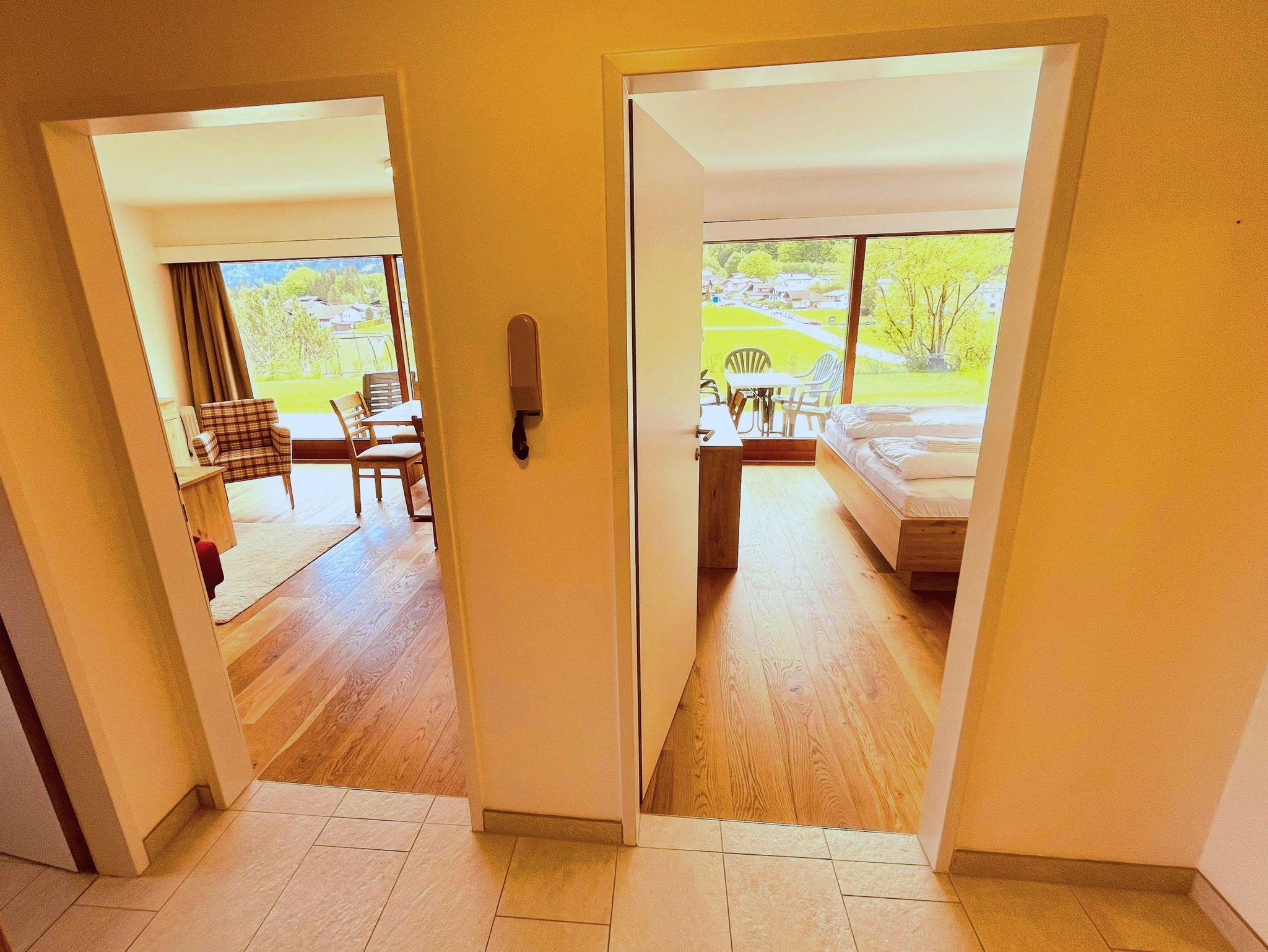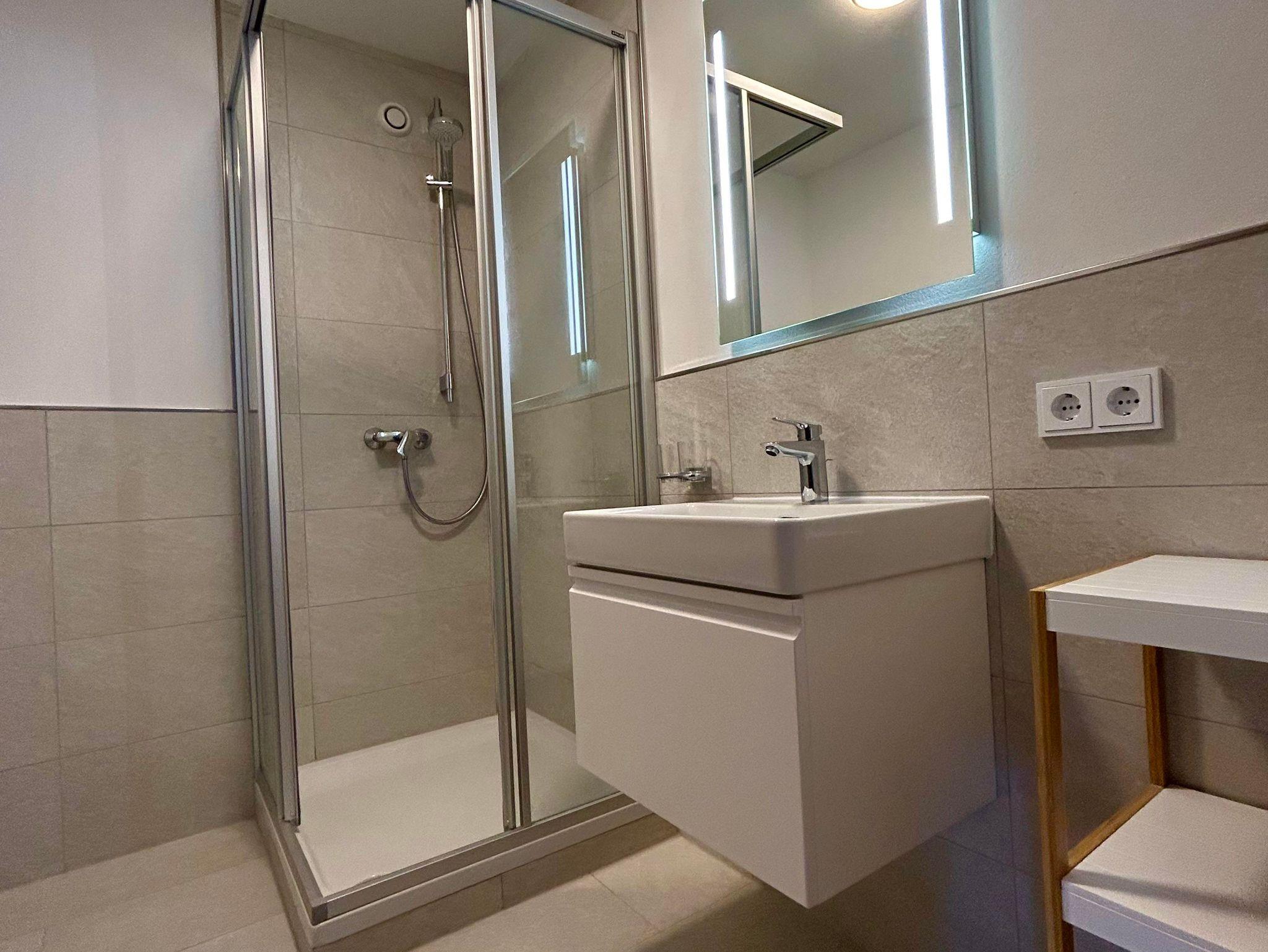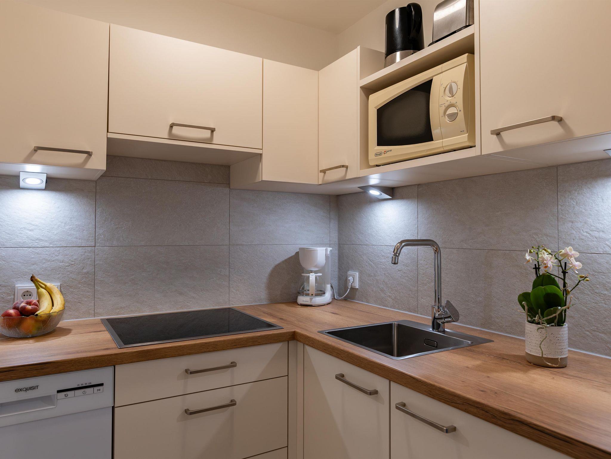 Raumhohe Panoramafenster schaffen eine helle und einladende Wohnatmosphäre. Das Wohnzimmer ist mit einem Doppelschlafsofa und einem gemütlichen Essbereich ausgestattet. Das Schlafzimmer bietet ein komfortables Doppelbett sowie ein Einzelschlafsofa. Zusätzlich stehen ein Sessel und ein Schreibtisch zur Verfügung – ideal zum Entspannen oder Arbeiten. Ein großer Flachbild-TV und High-Speed-WLAN sorgen für zeitgemäßen Komfort. Die raumhohen Fenster sowie die Terrasse erweitern den Wohnraum nach außen und laden zum Verweilen ein. Im Vorzimmer befindet sich eine praktische Garderobe. Die separate, voll ausgestattete Küche verfügt über vier Cerankochfelder, einen Kühlschrank, eine Geschirrspülmaschine, einen Mikrowellenherd, eine Kaffeemaschine, einen Wasserkocher und einen Toaster – perfekt für eine komfortable Selbstversorgung. Das separate Badezimmer ist mit einer modernen Regendusche ausgestattet. Im Keller steht allen Gästen eine gemeinschaftlich nutzbare Waschmaschine mit Münzeinwurf sowie ein Trockner zur Verfügung.