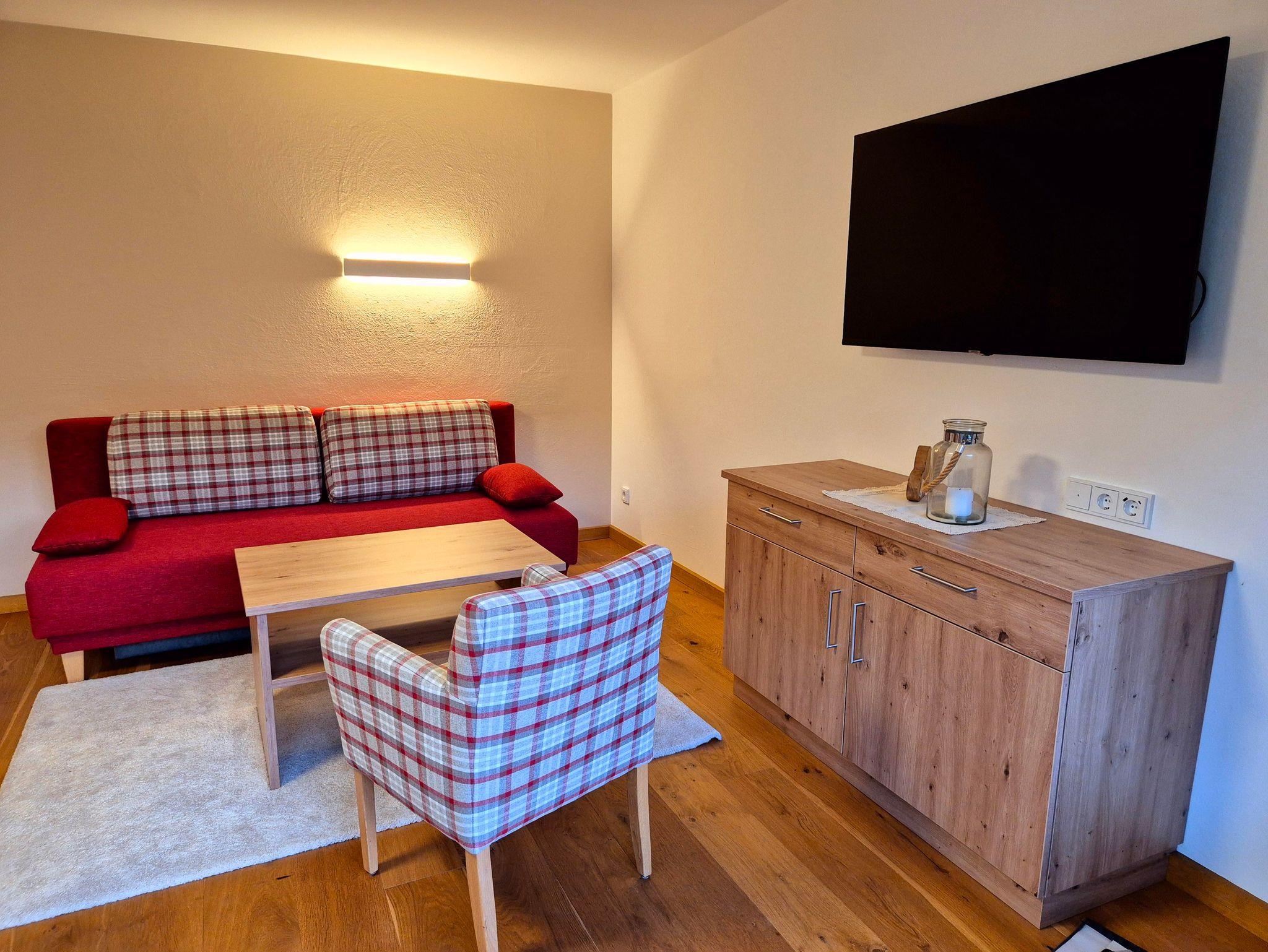 Wohnschlafzimmer mit zwei Couches und Tischchen, gepolsterter Eßecke und Bauernkomode. Dreibettzimmer mit 2 Fauteuils und Tischchen, Wandvertäfelung. Große Schiebetüre zum Liegebalkon bzw. zur Gartenterasse. Vorraum mit Schrank. Frisch renoviertes Badezimmer mit Dusche, Waschbecken, WC und Heizstrahler. Separate Küche mit 3-Platten-Herd, Kühlschrank, Geschirrspülmaschine, Mikrowellenherd, Dunstabzug, kompl. Geschirr, Kaffeemaschine. Farb-TV, Safe, Internetanschluss. Haustiere sind nicht erlaubt!