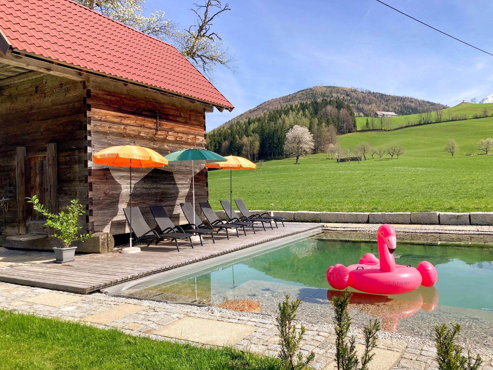 • Großer Garten mit Griller, Spielplatz, Sitzgelegenheiten, Naturschwimmteich mit Liegestühlen