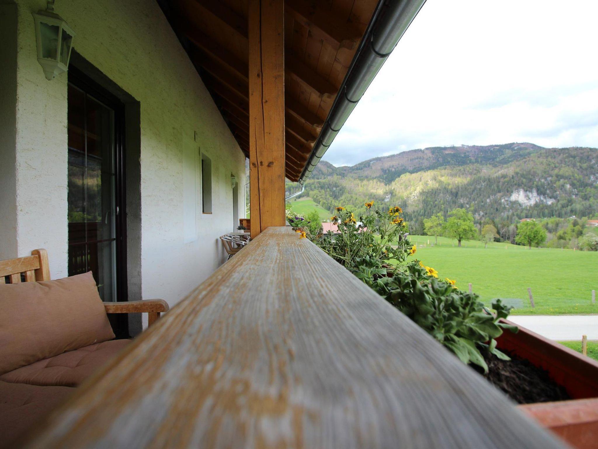 • Ostseitiger Balkon mit gemütlicher Sitzbank und Blick auf das Gebirge
