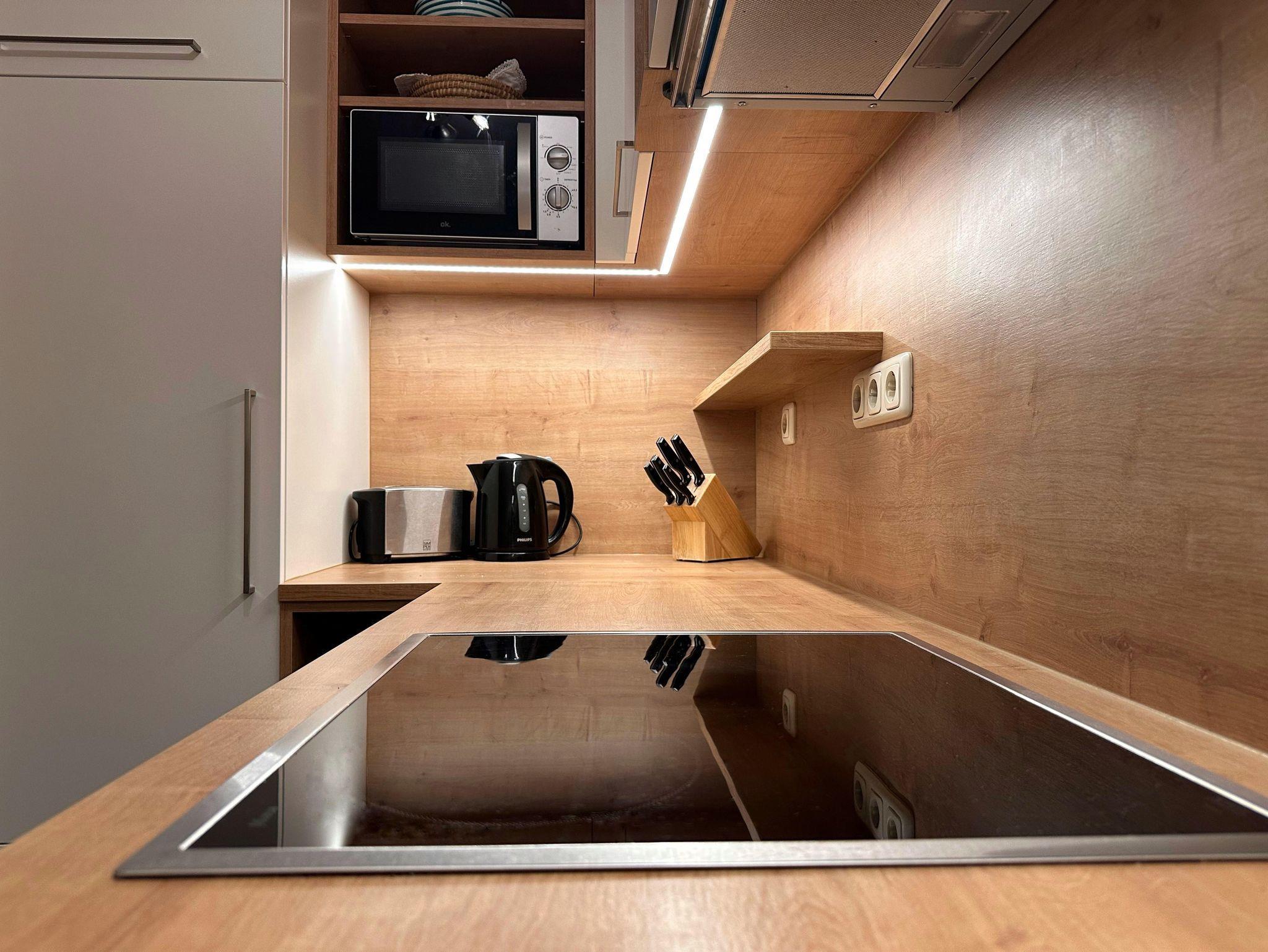• Voll ausgestattete Küche mit Backofen, Geschirrspüler, Kaffeevollautomat, Wasserkocher, Toaster, Mikrowelle, Kühlschrank und Gefrierfach