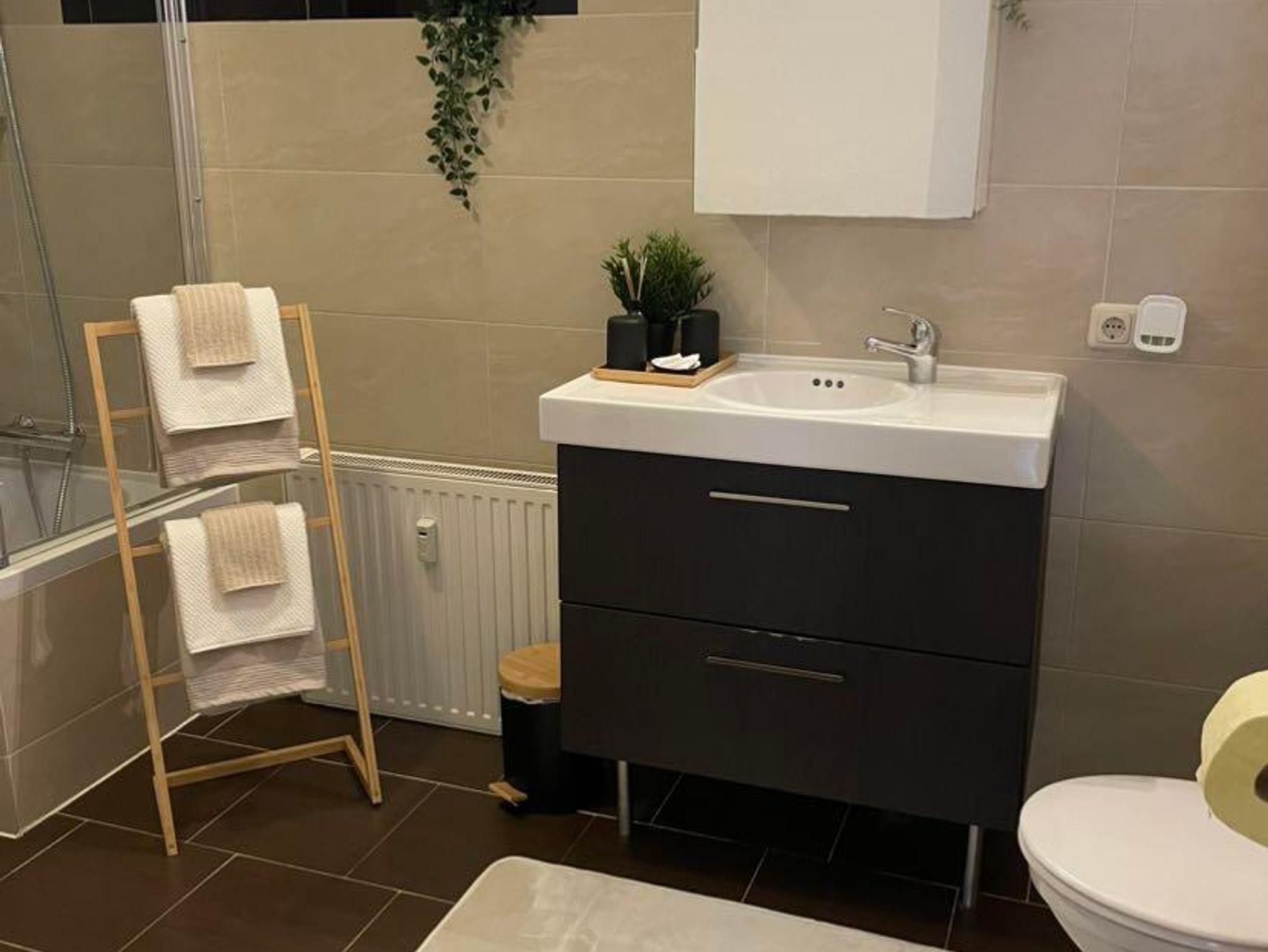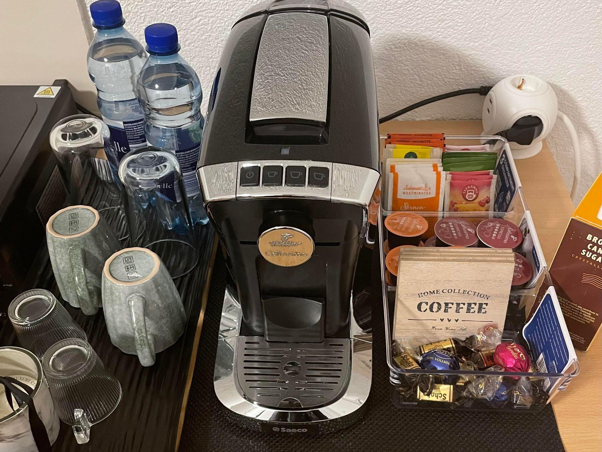 Die Küche ist ausgestattet mit allen notwendigen Annehmlichkeiten, wie einem Kühlschrank, Herd, Kaffeemaschine, Toaster, Wasserkocher und einer Mikrowelle. Eine kleine, einladende Küchenzeile bietet ausreichend Platz zum Kochen und Vorbereiten von Mahlzeiten. Ein kleines Badezimmer mit Dusche rundet die Wohnung ab und sorgt für Bequemlichkeit.