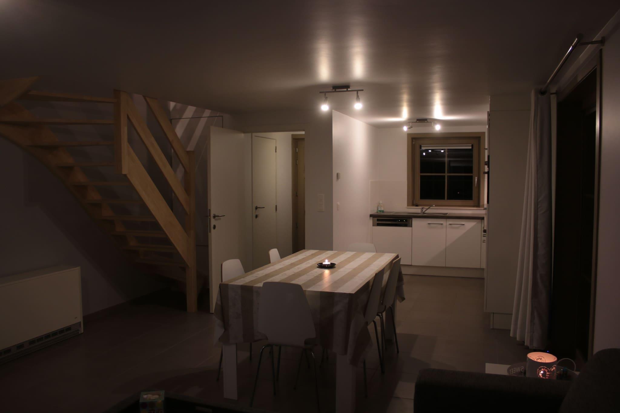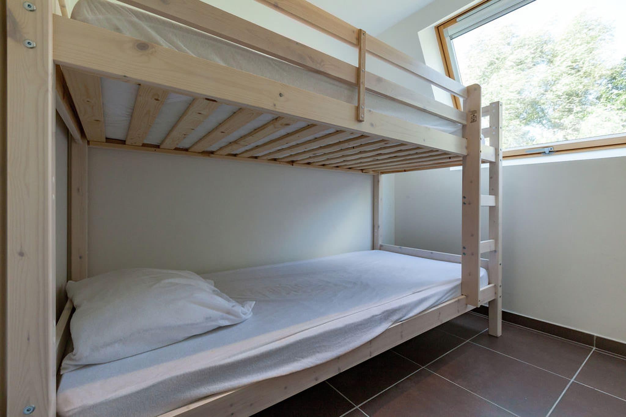Parterre: (keuken(kachel, oven, magnetron, afwasmachine, koelkast, vriezer), woon/eetkamer(TV, eettafel, zithoek, DVD-speler, stereo-installatie, verwarming, airconditioning), toilet) Op de 1e etage: (slaapkamer(2-pers. bed), slaapkamer(stapelbed), slaapkamer(1-pers. bed, 1-pers. onderschuifbed), badkamer(bad met douche, toilet)) terras(privé, omheind), tuin(privé), tuinmeubilair(6 personen), BBQ(houtskool), parking