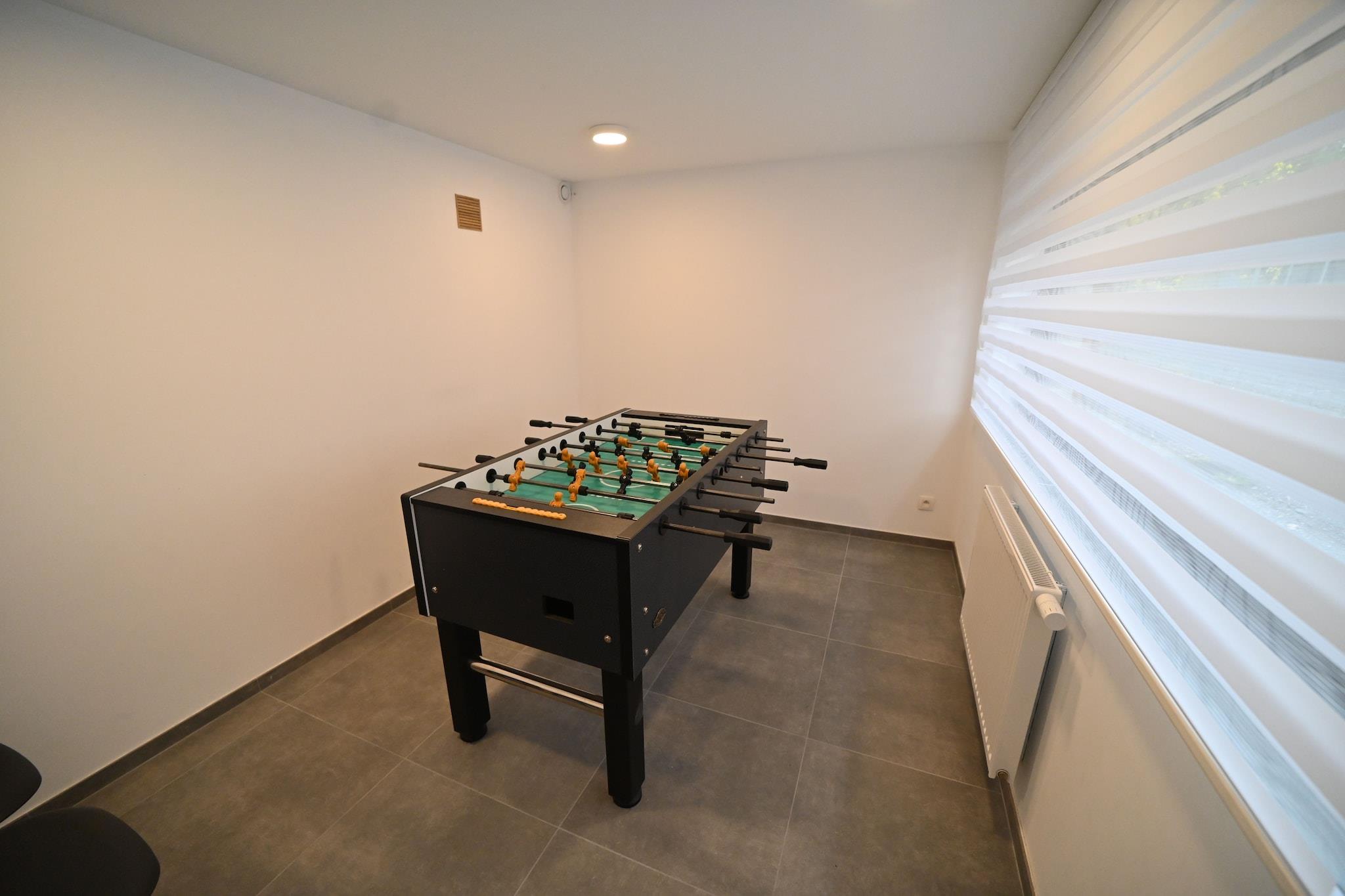 Parterre: (woonkamer(TV(flatscreen, digital), eettafel, zithoek, DVD-speler), zitkamer(zithoek), open keuken(eettafel, fornuis(inductie), koffiezetapparaat, oven, magnetron, afwasmachine, koelkast, vriezer), slaapkamer met badkamer(2-pers. bed, douche), slaapkamer met badkamer(2-pers. bed, douche), slaapkamer met badkamer(2-pers. bed, ligbad), slaapkamer met badkamer(2-pers. bed, douche), slaapkamer met badkamer(2-pers. bed, douche), slaapkamer met badkamer(2-pers. bed, douche), slaapkamer met badkamer(2-pers. bed, douche), kinderslaapkamer(3x 1-pers. bed, 2x 1-pers. onderschuifbed), kinderslaapkamer(1-pers. bed, stapelbed), toilet, recreatieruimte(Biljart, tafelvoetbal)) sauna(douche), wasdroger, wasmachine, verwarming(CV), terras, tuin, tuinmeubilair, BBQ, parking, zwembad(privé, binnen, 6 x 4 m.), jeu de boules baan, tafeltennistafel, tafelvoetbal, biljart, kinderstoel