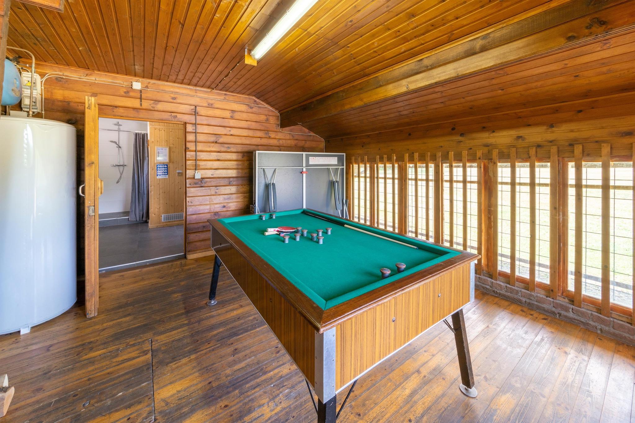 Parterre: (zitkamer(TV, open haard, zithoek, bar), eetkamer(eettafel), keuken(waterkoker, waterkoker, afzuigkap, koffiezetapparaat, koffiezetapparaat, oven, afwasmachine, koelkast, koelkast, koelkast, vriezer), slaapkamer met badkamer(1-pers. bed, 1-pers. bed, douche, wastafel), badkamer(douche, douche), badkamer(douche, sauna), toilet, speelkamer(tafeltennistafel, biljart)) Op de 1e etage: (slaapkamer(1-pers. bed, 1-pers. bed, 1-pers. bed, 1-pers. bed, wastafel), slaapkamer(1-pers. bed, 1-pers. bed, wastafel), slaapkamer(1-pers. bed, 1-pers. bed, 1-pers. bed, 1-pers. bed, wastafel), slaapkamer(1-pers. bed, 1-pers. bed, wastafel), slaapkamer(1-pers. bed, 1-pers. bed, wastafel), slaapkamer(1-pers. bed, 1-pers. bed, 1-pers. bed, wastafel), slaapkamer(1-pers. bed, 1-pers. bed, 1-pers. bed, wastafel), badkamer(douche), overloop(toilet, toilet)) tuin, tuinmeubilair, BBQ, parking, speeltoestellen, glijbaan, tafeltennistafel