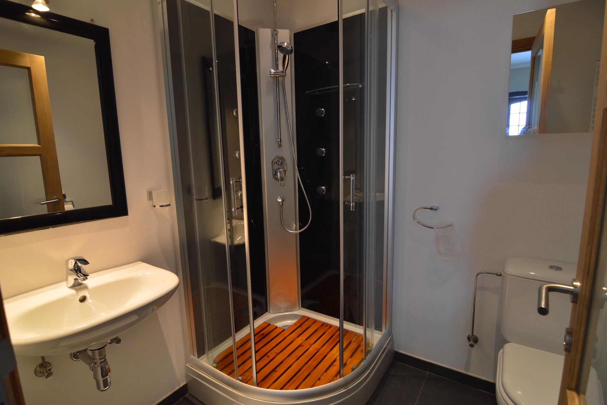 Parterre: (hal, woonkamer(TV, zithoek), keuken(fornuis(keramisch), koffiezetapparaat, oven, magnetron, afwasmachine, koel-/vriescombinatie), woon/eetkamer(open haard), toilet(toilet), bijkeuken(wasdroger, wastafel, wasmachine)) Op de 1e etage: (slaapkamer(3x 1-pers. bed), slaapkamer(2x 1-pers. bed), slaapkamer(2x 1-pers. bed), slaapkamer(2x 1-pers. bed), badkamer(ligbad, douche, wastafel, toilet), badkamer(douche, wastafel, toilet)) terras, tuin, tuinmeubilair, parking