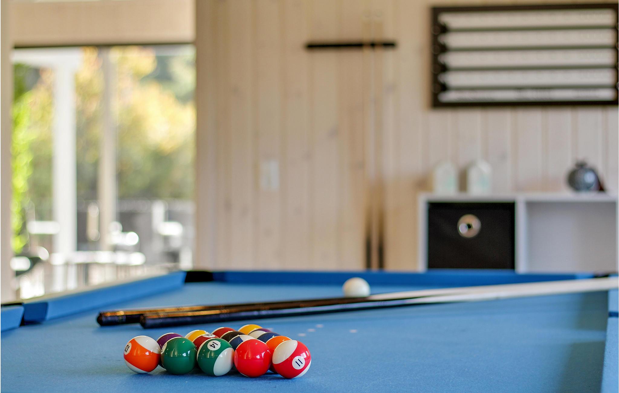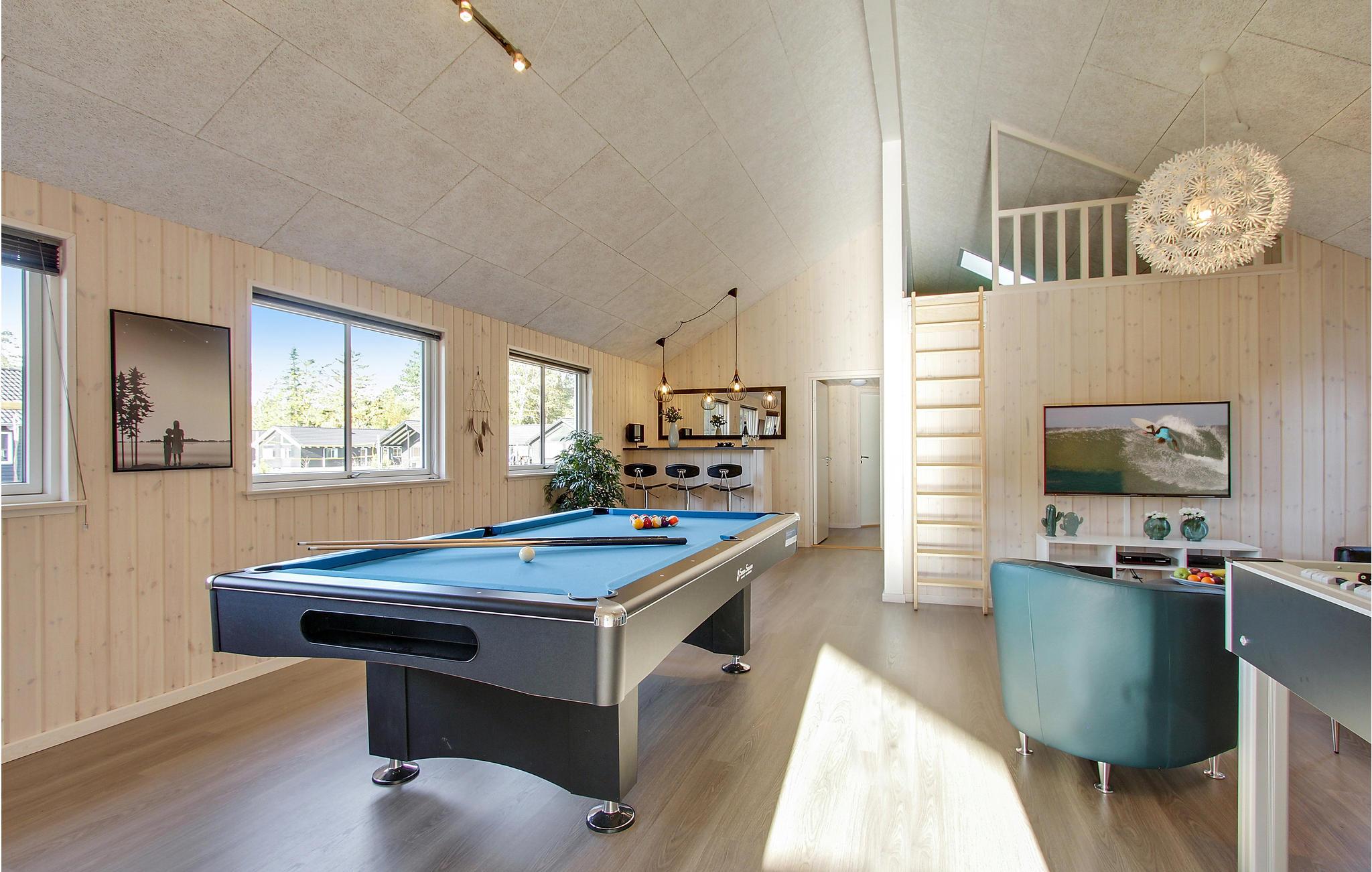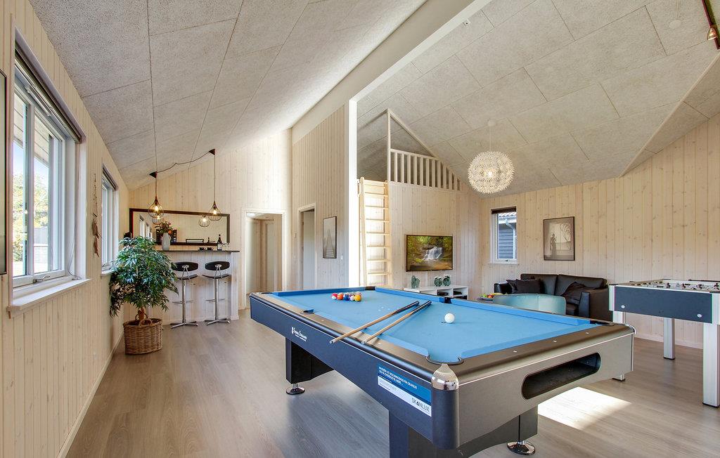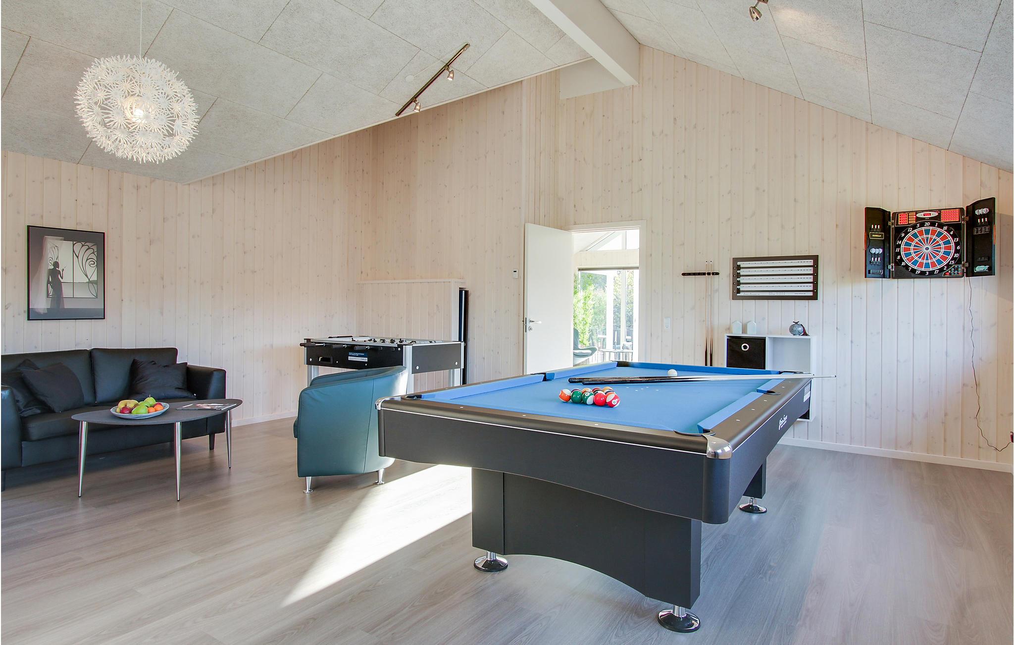 Interessant en mooi vakantiehuis, waar aandacht is besteed aan de kleinste details. Het huis is gemaakt voor een familievakantie, waarbij de kinderen bijvoorbeeld in het grote zwembad kunnen spelen. Hier vindt u ook de grote whirlpool en de rustgevende sauna. De activiteitenruimte daagt u uit tot familietoernooien in tafeltennis en biljart en in de kleine bar met koelkast kunt u uw eigen favoriete drankjes mixen. De grote mezzanine is erg gezellig en zeker populair bij de kinderen. De keuken is zeer goed uitgerust en aangepast aan de grootte van het huis, met twee fornuizen, twee vaatwassers en veel ruimte in de koelkast en vriezer. Het huis ligt in een prachtige omgeving met mooie natuur, het is maar een klein stukje rijden naar het strand. Een verbruikskorting en de eindschoonmaak worden samen met de overige verbruikskosten contant in het huis betaald. Beddengoed, handdoeken, kinderbed en kinderstoel kunnen gehuurd worden bij het plaatselijke -------- kantoor.