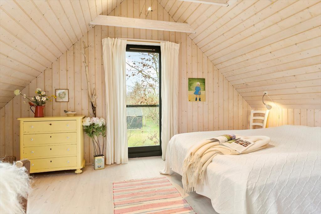 Der Schlafraum im Obergeschoss ist angenehm geräumig, verfügt über einen Schreibtisch und glänzt mit Ausblick auf die grüne Umgebung. Der Treppenvorraum begrüßt dich mit Sitzgelegenheiten und bietet sich als ruhiger, heller Rückzugsort an. Ein Zimmer im ersten Stockwerk wird ausschließlich durch den Eigentümer genutzt und ist daher abgeschlossen. Das Badezimmer mit Waschmaschine befindet sich im Erdgeschoss und präsentiert sich angenehm geräumig. Prägend sind die hellen Holzdecken und -wände, die sich durch das gesamte Mietobjekt ziehen. Sie verleihen dem Haus eine richtig schöne, überaus gemütliche Ferienhausatmosphäre.