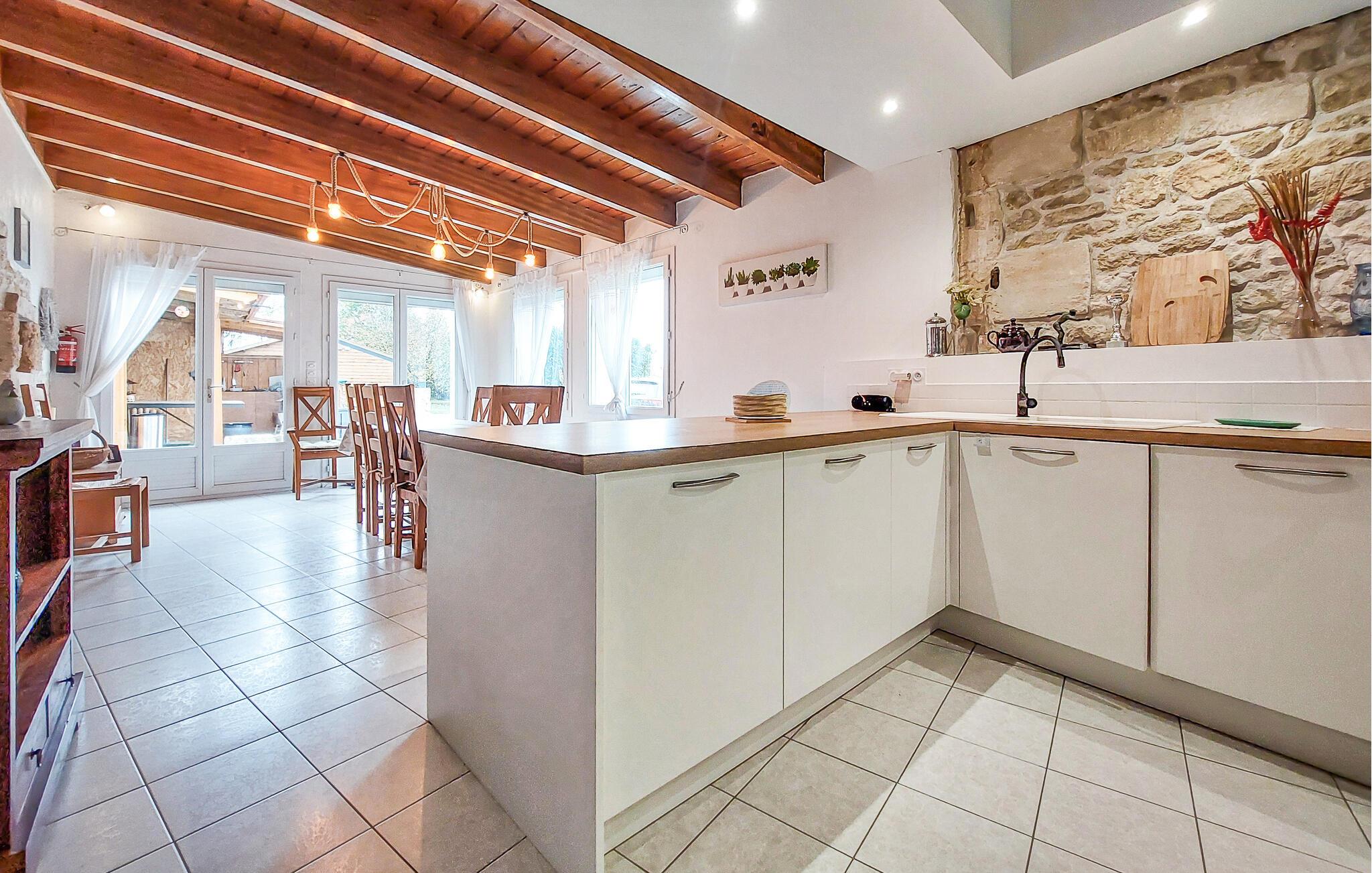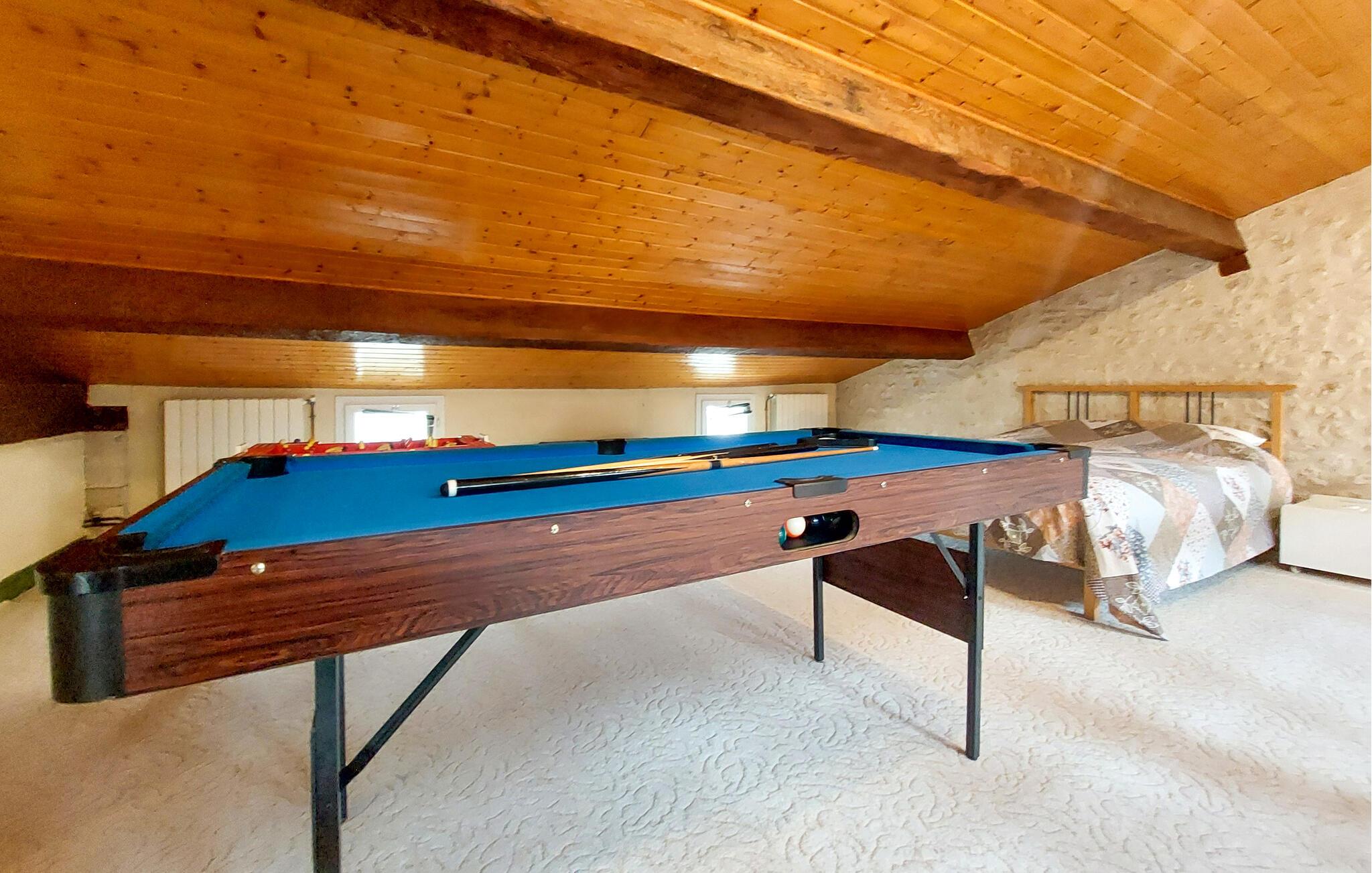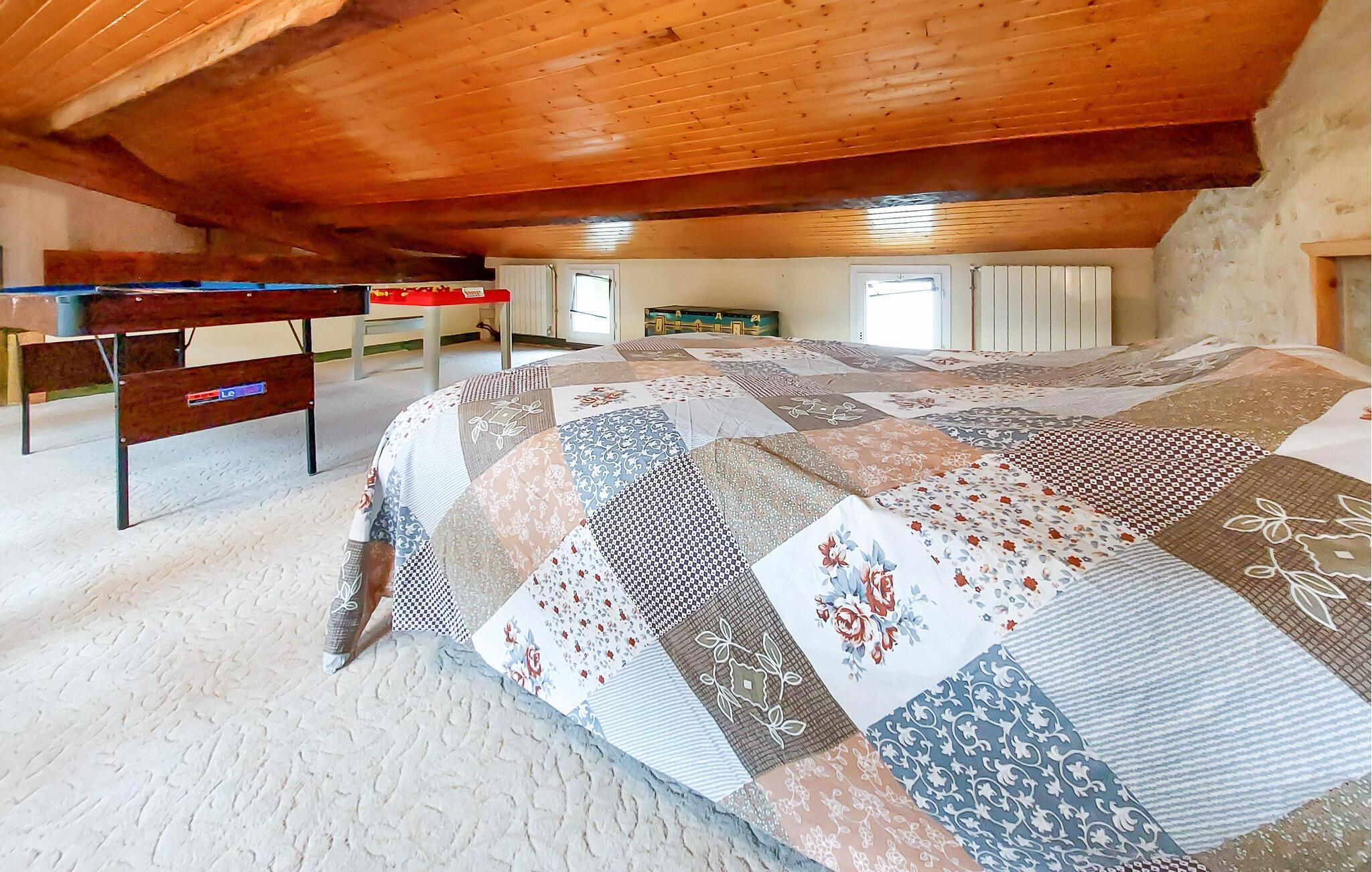 Omgeven door rust, natuur en charmante wandelpaden biedt dit ruime vakantiehuis de ideale setting voor een geslaagde vakantie. Kom binnen in de ruime woonkamer met zijn indrukwekkende stenen muur en hoge houten balken. Maak het jezelf gemakkelijk op de gezellige banken voor de open haard of geniet van een filmavond in de stijlvolle ambiance. De lichte eetkamer met grote ramen creëert een vriendelijke sfeer, en de open keuken nodigt je uit om regionale lekkernijen te bereiden. Boven vind je een extra retraite met een pooltafel en tafelvoetbal, ideaal voor plezier en gezelligheid.