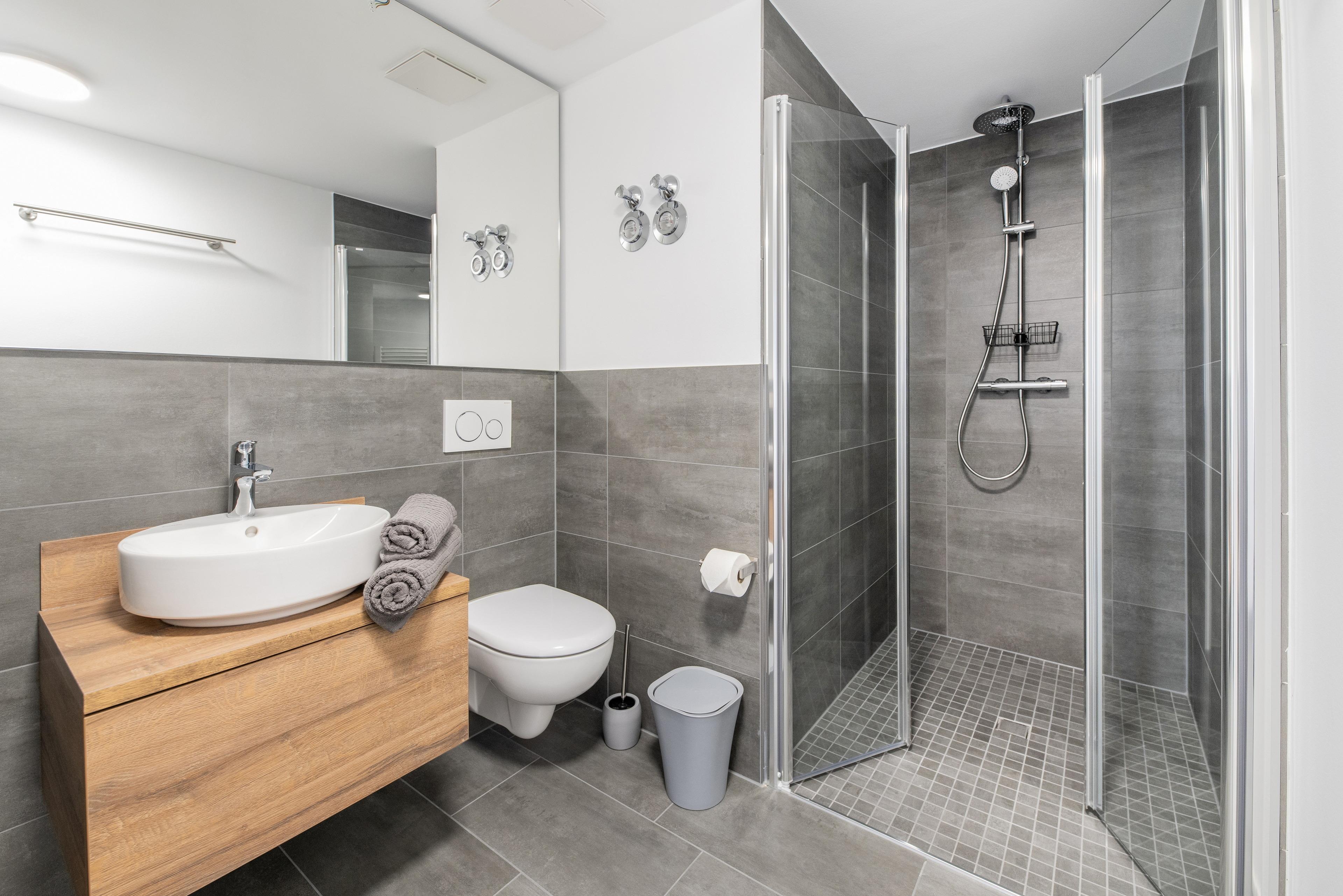 Das Bad ist mit einem großem Spiegel, Dusche, Waschbecken, WC und einem Haartrockner ausgestattet. Zusätzlich steht ein Set aus Zahnbürste, Schuhschwamm, Hygiene- und Nähutensilien, Körperlotion, Duschgel sowie zwei Toilettenpapierrollen zur Verfügung.